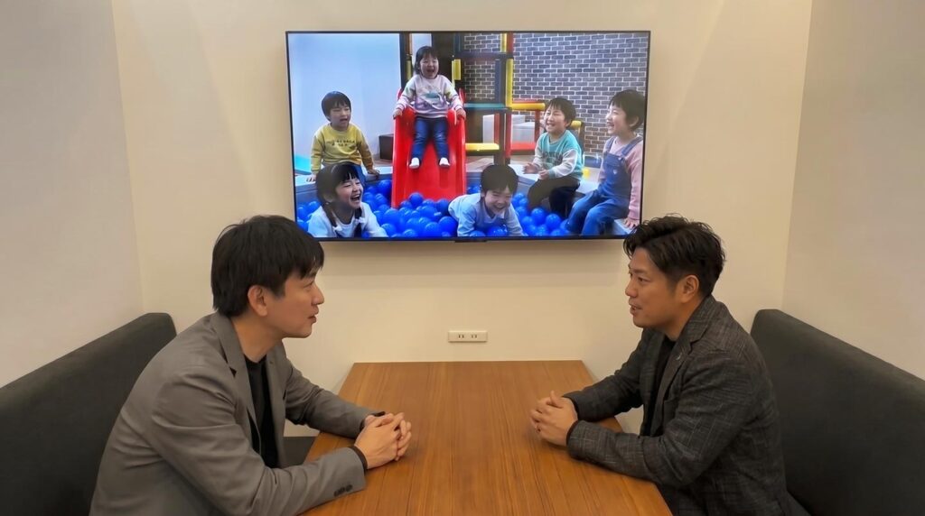 また「無人の映像を流し続けない」という設計思想も徹底。子どもがいない時間帯はPR映像に自動で切り替わり、遊び始めた瞬間にAIが検知してカメラ映像へシームレスに移行します。従来の監視カメラの俯瞰映像とは異なる、子どもたちの表情に寄り添った高画質映像が、新社屋全体を明るく彩ります。