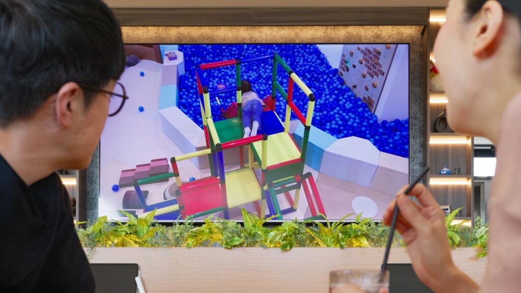 81FACTORY&CAFE 2F キッズカフェ大型ディスプレイにうつるキッズルーム